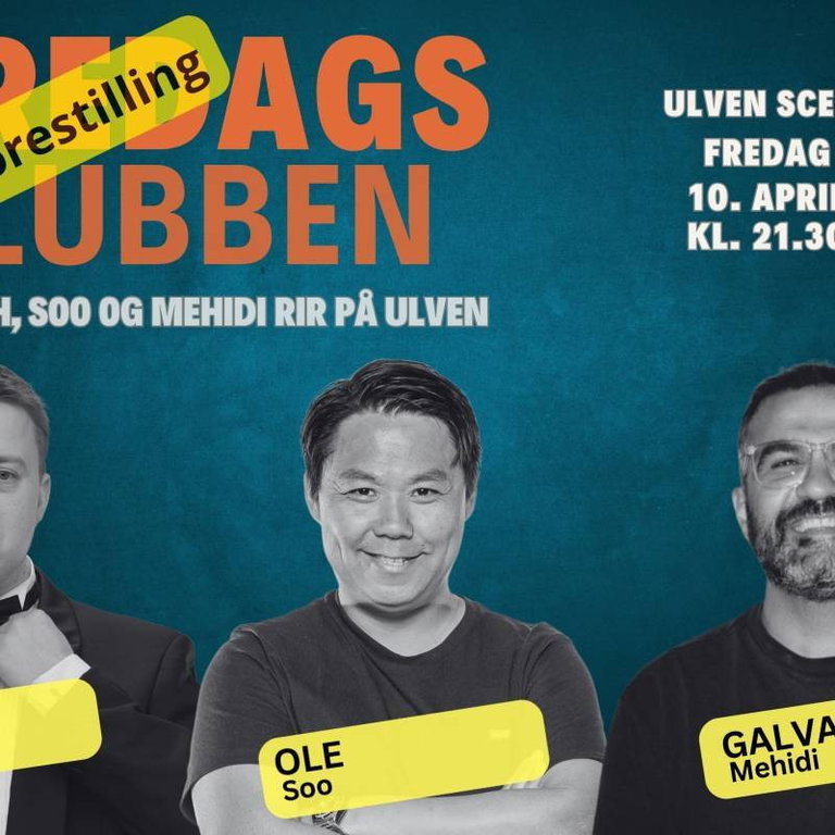 Tre av Norges mest slagkraftige komikere slår seg sammen på Ulven Scene! NÅ MED EKSTRAFORESTILLING Galvan Mehidi, kjent fra Ikke lov å le på hytta og podkasten Med all respekt, leverer ærlig og ufiltrert humor med glimt i øyet. Ole Soo, sett i Bordtenniskameratene og Rikets Roast, byr på presise observasjoner og rå timing. Henrik Fladseth, som nylig imponerte i 71 grader nord og med soloshowet Lavkultur, tar scenen med sin karakteristiske energi og selvsikre stil. Tre fantastiske komikere, én kveld — dette blir standup med smell på Ulven Scene!